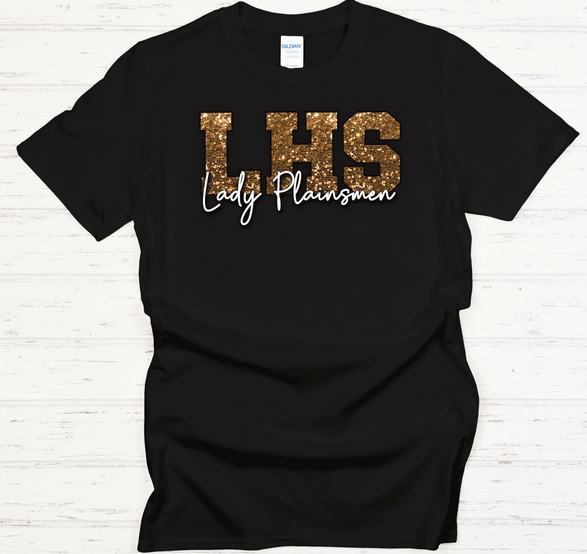 Bring the sparkle without the mess! This gorgeous LHS Lady Plainsmen tee features bold gold faux glitter lettering that shines bright on a rich maroon backdrop — giving you all the glam without any actual glitter fallout. No shedding, no flaking, just pure game-day glow.